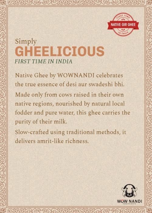 Native Ghee by WOWNANDI celebrates the True essence of desi aur swadeshi bhi. Made only from cows raised in their own regions, nourished by natural local fodder and pure water, this ghee carries the purity of their milk.