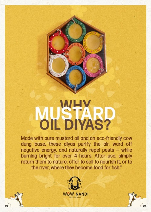 Made with Pure Mustard oil and eco-friendly cow dung base, these diyas purify the air, ward off negative energy, and naturally repel pests - while burning bright for over 4 hours. After use, simply return them to nature: offer to soil: to nourish it, or to the river, where they become food for fish.
