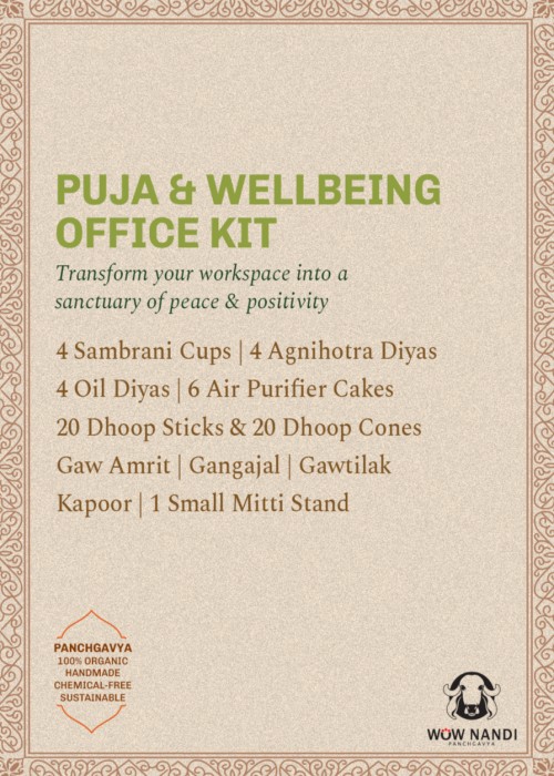 Transform your workspace into a sanctuary of peace and positivity with Nandi Panchgavya's Office Pooja and Wellness Kit. Curated with precision, this kit merges traditional practices with the modern-day need for tranquility and air purification. Ideal for the dynamic professional, our Office Kit is designed to fit seamlessly into your work environment, offering a touch of divinity amidst the hustle.